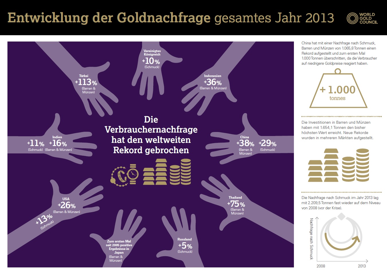 Einen neuen Rekordwert erreichte dafür die weltweite Nachfrage nach Goldmünzen und Goldbarren. Sie lag mit 1.654,1 Tonnen 28 Prozent über Vorjahr. Wertmäßig entsprach dies einer Nachfrage von 75,05 Milliarden US-Dollar, das waren 9 Prozent mehr als 2012.