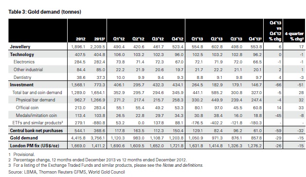 Der World Gold Council (WGC) hat Goldmarkt-Zahlen für das Gesamtjahr 2013 veröffentlicht. Die gesamte weltweite Goldnachfrage im vergangenen Jahr wird mit 3,756.1 Tonnen beziffert. Sie ging damit gegenüber Vorjahr um 15 Prozent zurück. In US-Dollar gemessen betrug der Rückgang mit einem Wert von 170,42 Milliarden US-Dollar sogar 28 Prozent.