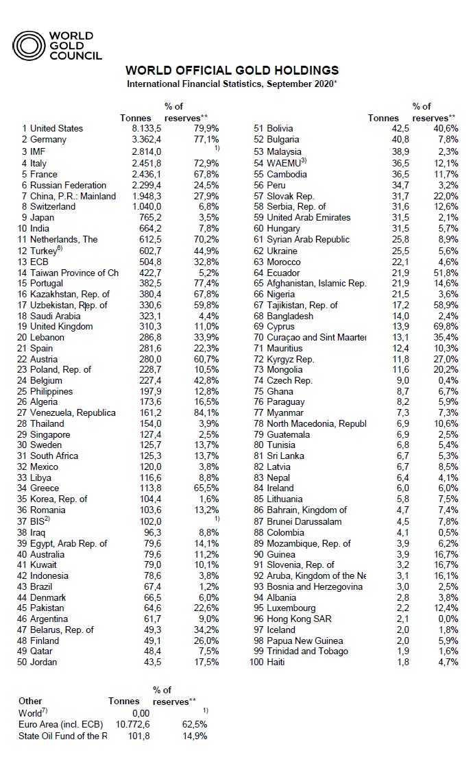Weltweite Goldreserven 09-2020