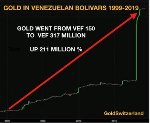 Nichts zeigt besser die Wahrheit als Gold. 1997 stand der Goldpreis in Venezuela bei 150 Bolivar oder VEF pro Unze. Heute sind es 317 Millionen VEF! Das ist ein Anstieg um 211 Millionen Prozent!
