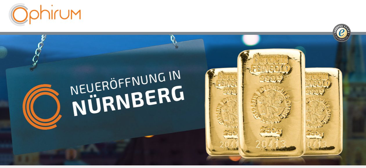 In Nürnberg gibt es eine neue Anlaufstelle für Gold- und Silber-Käufer. Der Frankfurter Edelmetall-Händler Ophirum hat in der Region eine Filiale eröffnet. Der Standort befindet sich im Nürnberger Südwestpark im Stadtteil Gebersdorf, direkt an der Südwest-Tangente (A73). Angeboten werden laut Unternehmensangaben alle gängigen Silber- und Goldmünzen zu tagesaktuellen Kursen. Außerdem kauft man alle gängigen Silber- und Goldanlageprodukte an.
