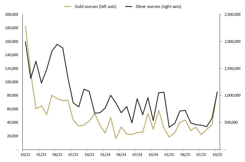 Noch stärker fiel der Anstieg beim Umsatz aus. Bewertet man die Oktober-Lieferungen mit dem durchschnittlichen Goldpreis von 4.053 US-Dollar pro Unze (London-Referenz), ergibt sich ein Gegenwert von 347 Millionen US-Dollar. Das bedeutet ein Plus von 330 Prozent gegenüber Oktober 2024 und von 158 Prozent gegenüber September. Der deutlich höhere Goldpreis – rund 50 Prozent über Vorjahr – verstärkte diesen Effekt zusätzlich.
