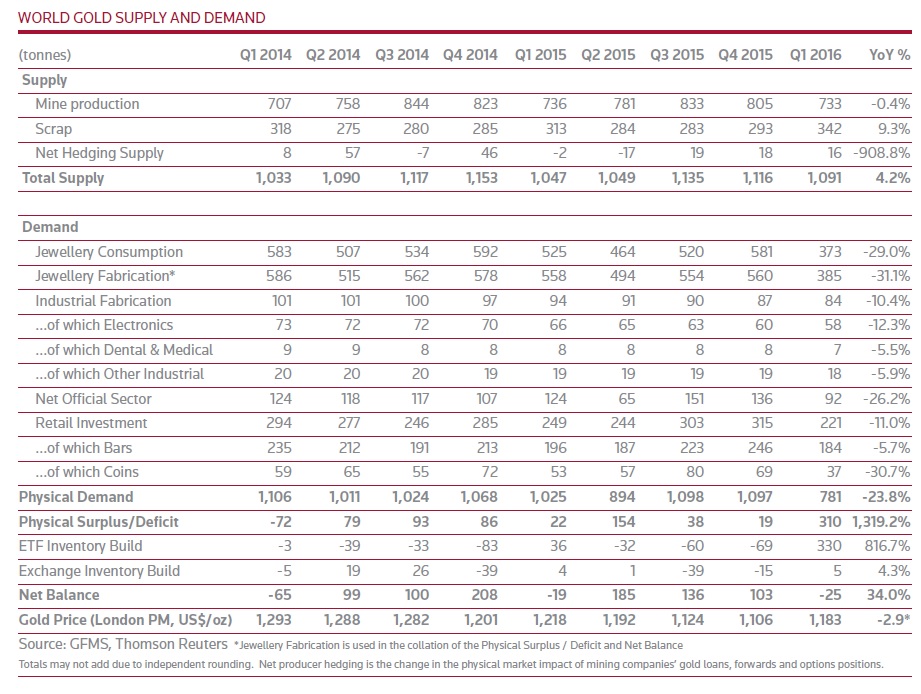 Laut den aktuellen Marktzahlen von GFMS sind sowohl Goldnachfrage als auch Goldangebot aus Minenproduktion im ersten Quartal 2016 zurückgegangen.