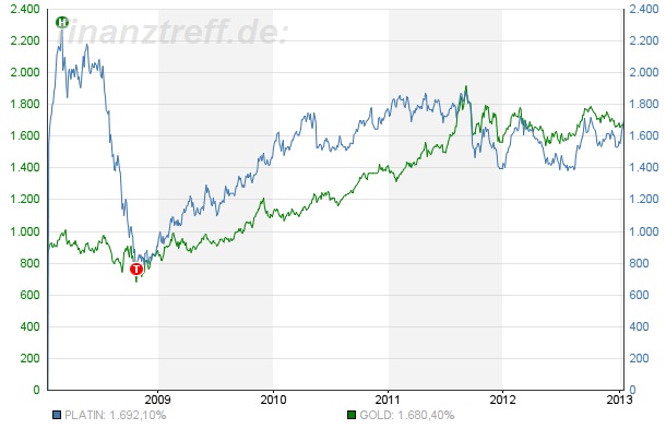 1. Das bedeutet nicht viel. Als Industriemetall unterliegt Platin beachtlichen Schwankungen. 2012 schwankte die Unze zwischen 1.390$ und 1.729$. Diese Pendelbewegung zog sich durch das ganze Jahr. Für mich als physischer EM-Hamsterer ist Platin sowieso kein Thema. Hohe Prägekosten, Ankaufskurse unter Spot und 20%(A)19%(D)Märchensteuer machen Platin uninteressant. Schade, ein Maple in Pt hat schon was.