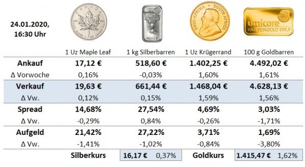 Auch das Aufgeld beim Kauf von 100-Gramm-Goldbarren ist deutlicher, auf weniger als 2 Prozent gefallen. Hintergrund: Einmal wöchentlich ermittelt Goldreporter Durchschnittspreise für wichtige Anlageprodukte im deutschen Edelmetallhandel. Dabei werden die Werte von vier Inline-Händler gemittelt.
