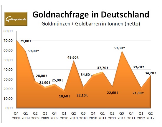 Laut den Angaben des World Gold Council wurden im zweiten Quartal 2012 in Deutschland 34,2 Tonnen Gold in Form von Barren und Münzen nachgefragt.