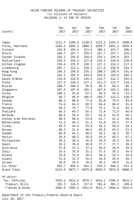 Das US-Finanzministerium hat neue Zahlen zur Auslandsverschuldung der Vereinigten Staaten veröffentlicht. Per Ende Mai 2017 war der US-Staat über Staatspapieren mit 6.123,6 Milliarden Euro bei ausländischen Investoren verschuldet. Es war der höchste Wert seit September 2016.