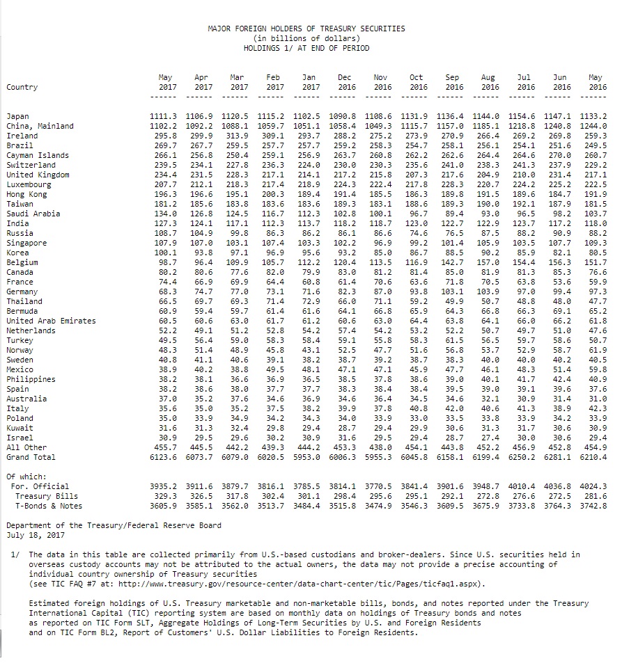 Das US-Finanzministerium hat neue Zahlen zur Auslandsverschuldung der Vereinigten Staaten veröffentlicht. Per Ende Mai 2017 war der US-Staat über Staatspapieren mit 6.123,6 Milliarden Euro bei ausländischen Investoren verschuldet. Es war der höchste Wert seit September 2016.