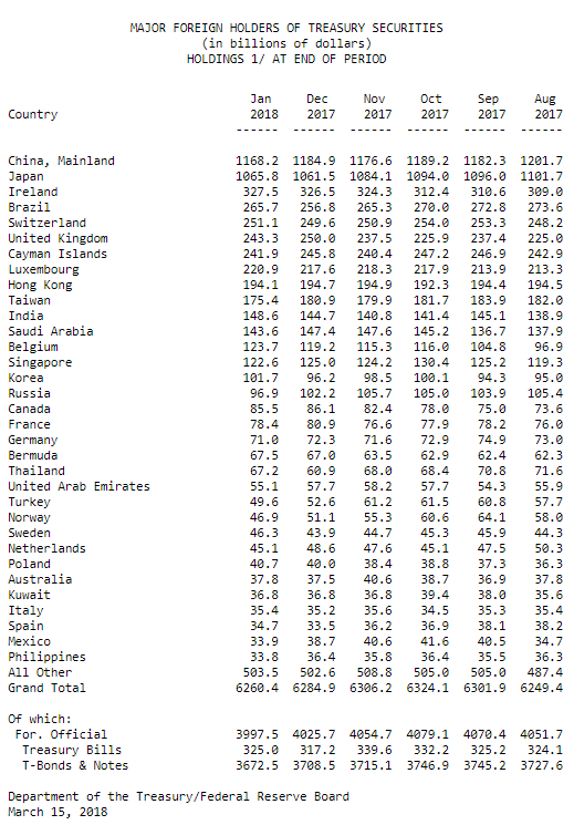 Auch Russland hat im Januar US-Staatspapiere verkauft. Mit 96,9 Milliarden US-Dollar war man mit 5,3 Milliarden US-Dollar weniger investiert als einen Monat zuvor. Das entspricht einem Rückgang um 5,2 Prozent. Auch gesamte Auslandsverschuldung der USA ist im Januar gefallen – und zwar um 22,5 Milliarden US-Dollar auf 6.260,4 Milliarden US-Dollar. Weitere Details entnehmen Sie der Tabelle oben.