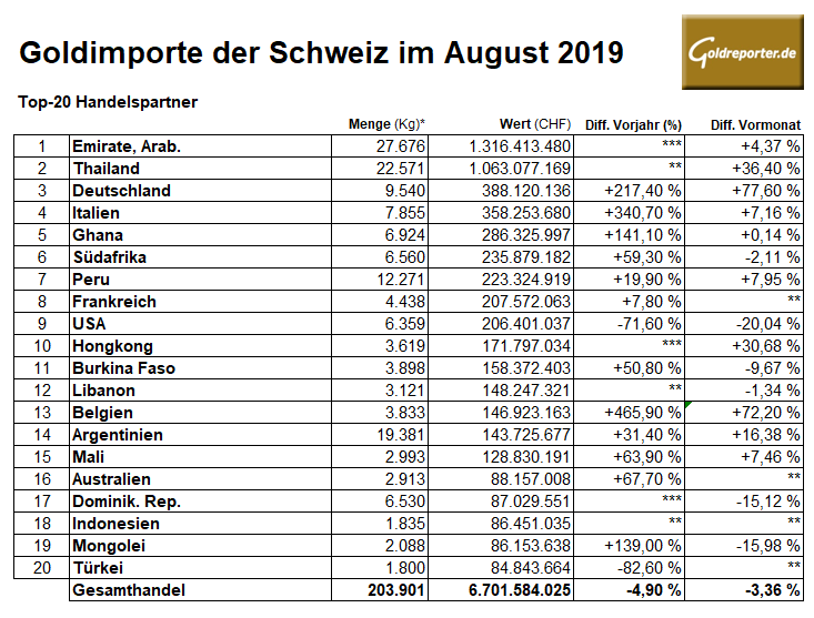 Die Goldimporte der Schweiz gingen im August auf 203,9 Tonnen zurück. Gegenüber Vormonat ergibt sich ein Minus von 3 Prozent, im Vergleich zum Vorjahr wurde knapp 5 Prozent weniger Gold eingeführt. Größte Lieferanten waren die Vereinigten Arabischen Emirate (27 Tonnen) und Thailand (22 Tonnen). Größere Mengen mit niedrigerem Feingehalt, vermutlich aus der Minenproduktion, stammten aus Peru (12 Tonnen) und Argentinien (19 Tonnen).