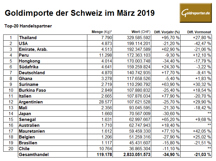 Schweiz liefert im März 65 Tonnen Gold nach Fernost
