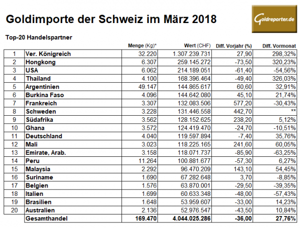 Insgesamt liefert die Schweiz im vergangenen März 124,38 Tonnen Gold im Wert von 5.024,73 Millionen CHF (4.205 Mio. Euro) ins Ausland. Die Exportmenge lag 8,6 Prozent unter Vorjahr und 15 Prozent unter Vormonat.