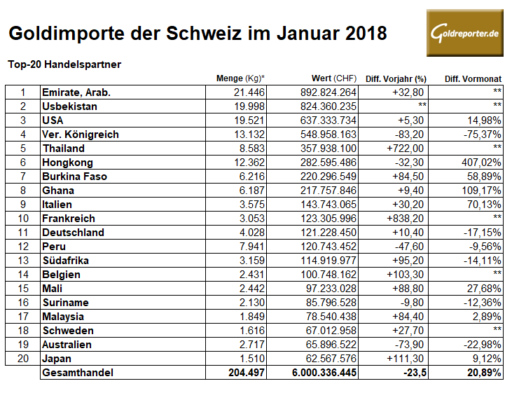 Schweiz 01-2018 Goldimporte