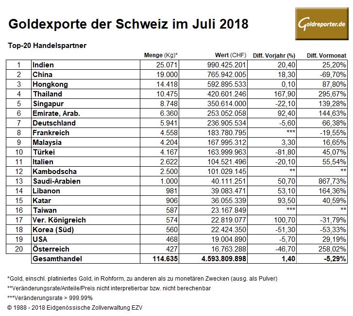 Schweiz lieferte im Juli 85 t Gold nach Fernost