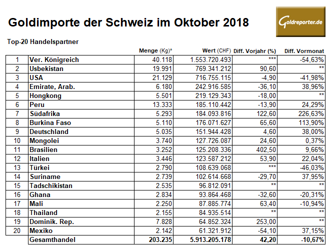 Goldimporte Schweiz 10-2018
