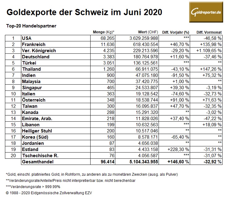 Gold-Exporte Schweiz 06-2020