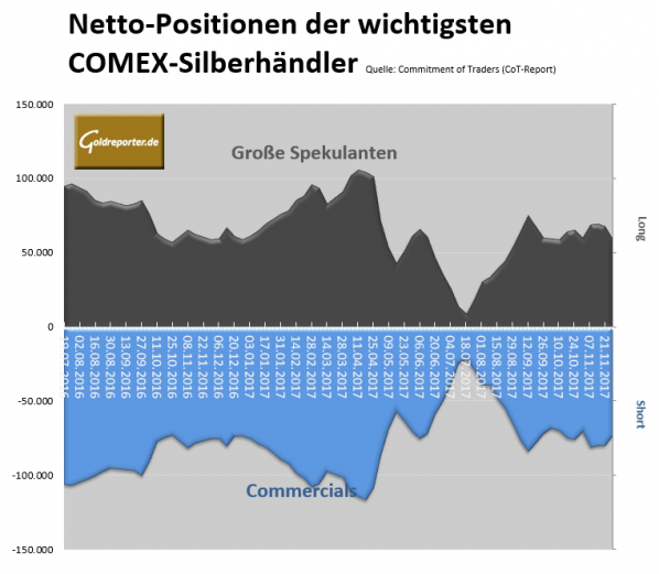 Die jüngsten wöchentlichen CoT-Daten zum US-amerikanischen Silber-Futures-Handel an der COMEX zeigen per 28. November 2017 folgende Veränderungen innerhalb der wichtigsten Händlergruppen.