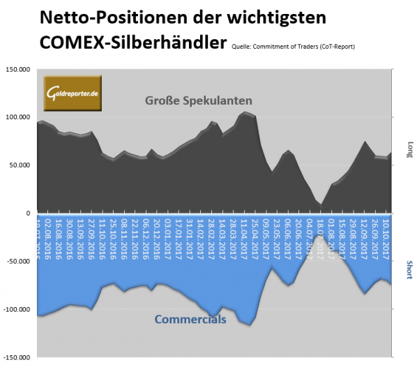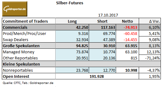 Die wöchentlichen CoT-Daten vom US-amerikanischen Silber-Futures-Handel zeigen per 17. Oktober 2017 folgende Veränderungen.