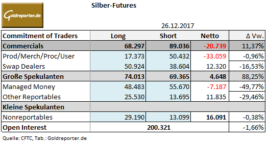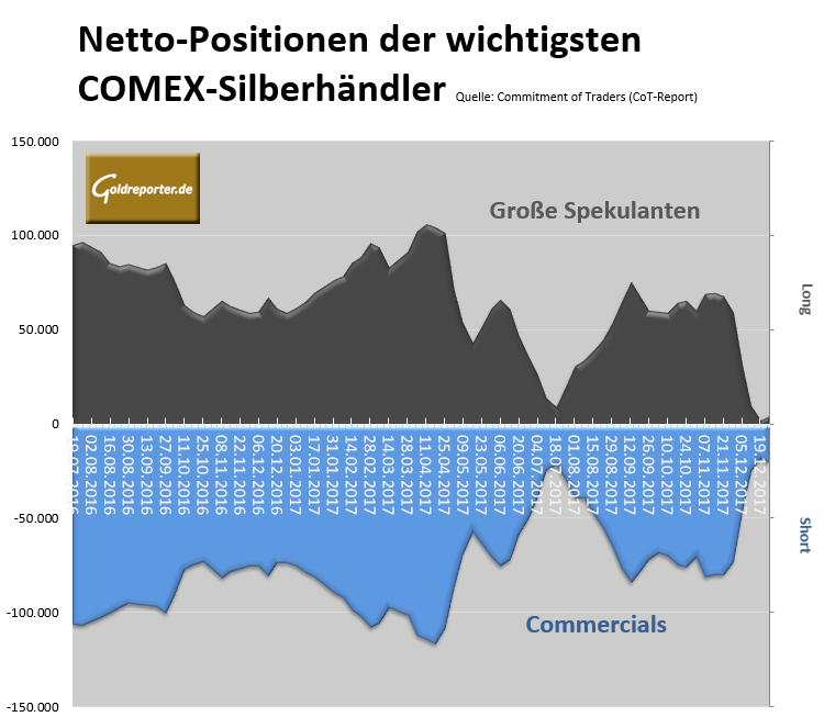 Die Netto-Short-Position der „Commercials“ ist um 11 Prozent gestiegen auf 20.739 Kontrakte. Die „Swap Dealers“ (darunter die Großbanken) befindet sich weiter auf der Käuferseite. Auch wenn deren Netto-Long-Position um 16 Prozent zurückgegangen ist auf 12.320 Kontrakte.