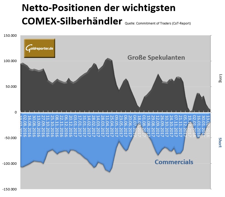 Per 20. Februar 2018 gab es im US-Handel mit Silber-Futures laut den jüngsten CoT-Daten folgende Positions-Veränderungen bei den größten Händlergruppen.