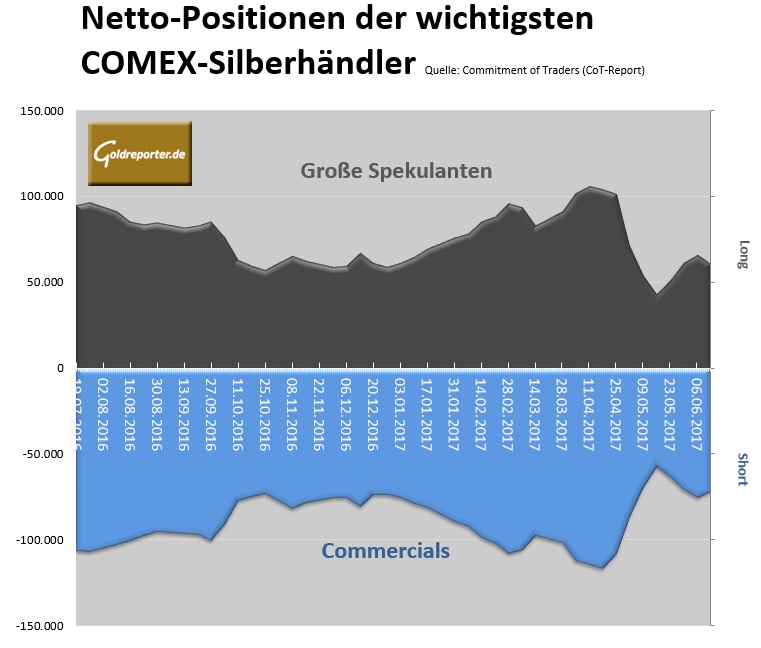 Die von der US-Börsenaufsicht CFTC am Freitag veröffentlichten Daten zeigen per 13. Juni 2017 folgendes Bild. Die Netto-Short-Position der „Commercials“ sank gegenüber Vorwoche um knapp 5 Prozent auf 71.913 Kontrakte.