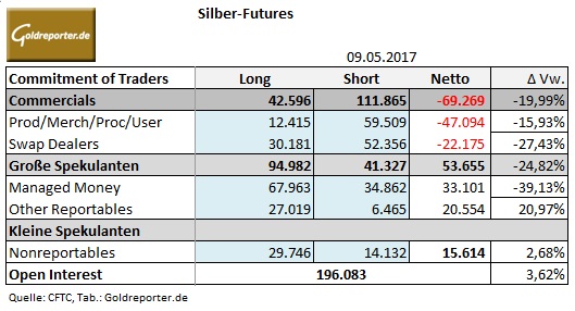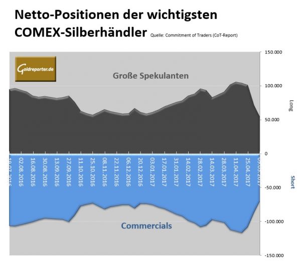 Die Netto-Short-Position der kommerziellen Silber-Händler am US-Terminmarkt ist innerhalb der vergangenen drei Woche um 40 Prozent gesunken. Zuletzt wurden jedoch wieder mehr Silber-Futures gehandelt.