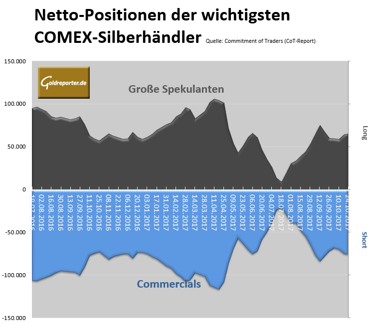 Die wöchentlichen CoT-Daten zum Silber-Futures-Handel an der US-Warenterminbörse COMEX zeigen per 24. Oktober 2017 folgende Veränderungen.