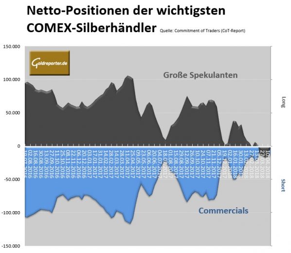Die aktuellen COT-Daten vom Handel mit Silber-Futures an der US-Warenterminbörse COMEX zeigen per 17. April 2018 folgende Veränderungen in den Positionen der bedeutendsten Händlergruppen.