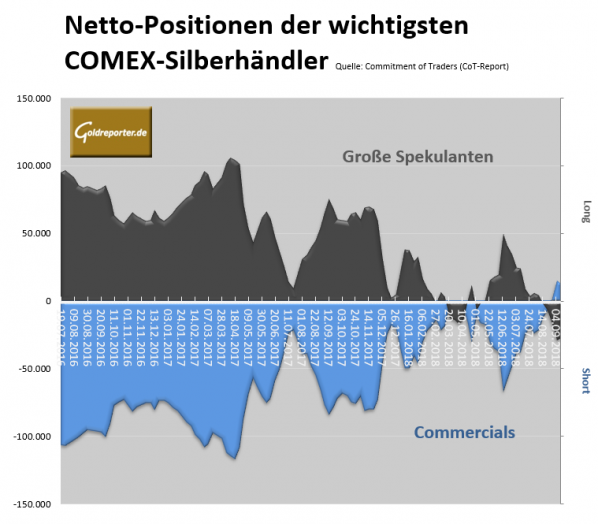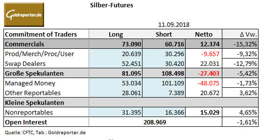 Die jüngsten CoT-Zahlen vom Handel mit Silber-Futures an der US-Warenterminbörse COMEX weisen per 11. September 2018 folgende Veränderungen in den Positionen der bedeutendsten Händlergruppen aus.