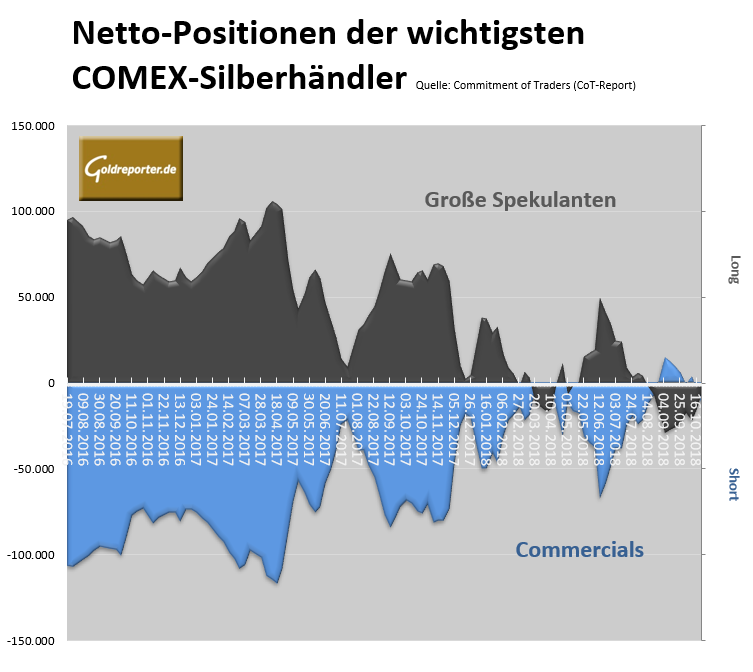 Die jüngsten CoT-Zahlen vom Handel mit Silber-Futures an der US-Warenterminbörse COMEX weisen per 23. Oktober 2018 folgende Veränderungen auf in den Positionen der bedeutendsten Händlergruppen.