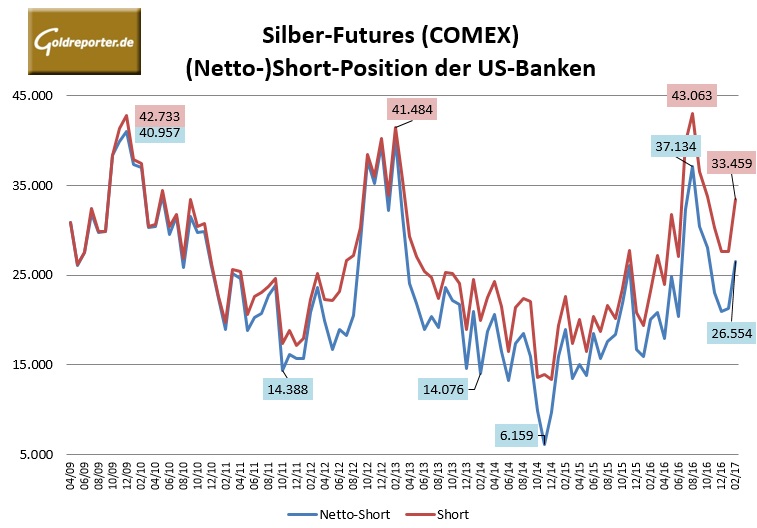 Per 7. Februar 2017 stieg die Netto-Short-Position dieser Institute gegenüber Vormonat um 24 Prozent auf 26.554 Kontrakte. Das entspricht Vorwärtsverkäufen im Umfang von 4.129 Tonnen Silber. Diese Position wird von nur fünf US-Banken gehalten. Mit einem Kontrakt handelt man an der COMEX 5.000 Unzen Silber.