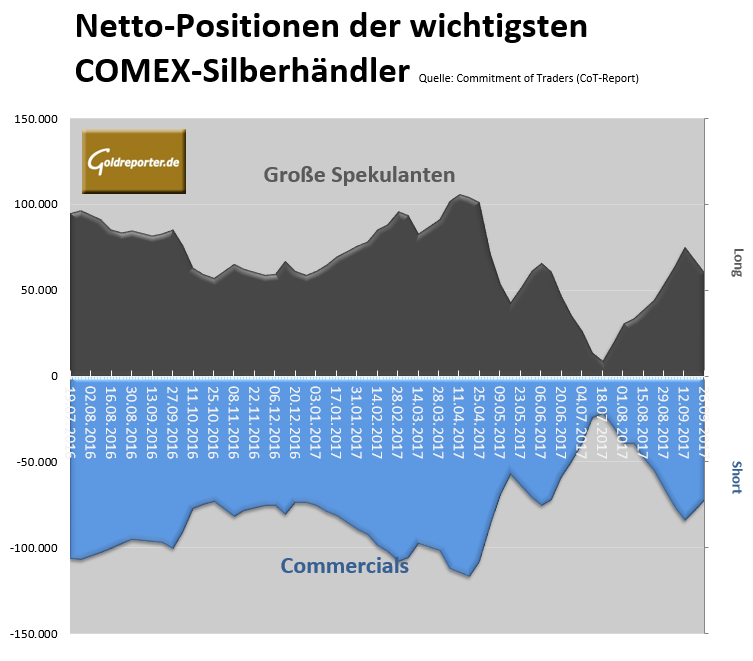 Die Netto-Short-Position der „Commercials“ sank per 26. September 2017 um knapp 8 Prozent auf 72.266 Kontrakte. Die „Swap Dealers“ kürzten ihre Verkaufsposition um 17 Prozent ein auf 12.383 Kontrakte.