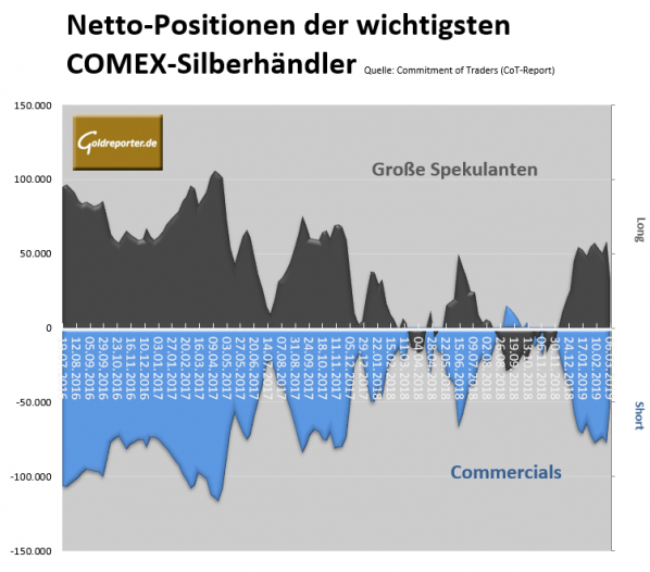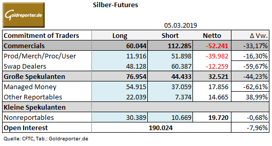 Die US-Börsenaufsicht CFTC hat die Positionen der größten Händlergruppen auf dem Markt für Silber-Futures per 5. März 2019 veröffentlicht.
