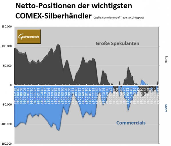 Erstmals seit 17 Wochen sind die „Großen Spekulanten“ im Handel mit Silber-Futures an der US-Warenterminbörse COMEX wieder netto-long positioniert.