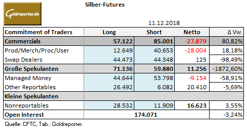 Die jüngsten CoT-Daten vom Handel mit Silber-Futures an der US-Warenterminbörse COMEX zeigen per 11. Dezember 2018 folgende Veränderungen in den Positionen der größten Händlergruppen.