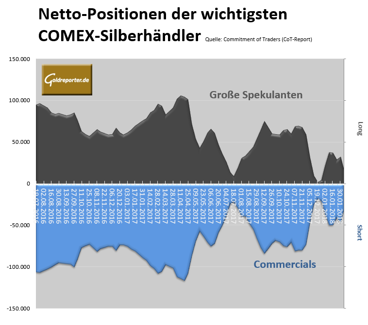 Die Netto-Short-Position der „Commercials“ sank um 35 Prozent auf 30.641 Kontrakte. Die „Swap Dealers“ wechselten sogar wieder auf die Käuferseite. Die Untergruppe, zu der auch Großbanken zählen, hielt am vergangenen Dienstag eine Netto-Long-Position im Umfang von 6.628 Kontrakten. Das entspricht immerhin Terminkäufen von 1.030 Tonnen. Das letzte Mal hielten die „Swap Dealers“ eine solch umfangreiche Kaufposition Ende Dezember. Danach stieg der Silberpreis deutlich an.