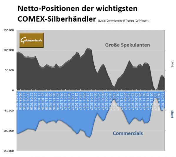 Die jüngsten wöchentlichen CoT-Daten vom Handel mit Silber-Futures an der Warenterminbörse COMEX zeigen per 23. Januar 2018 folgende Veränderungen.
