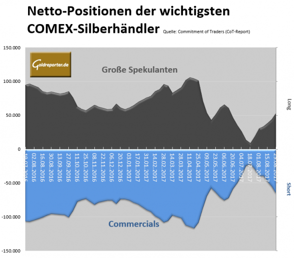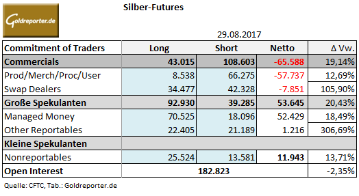 Was lässt sich daraus ableiten: Innerhalb der Gruppe der „Großen Spekulanten“ sind die Hedgefonds und Investmentgesellschaften, die zum „Managed Money“ gezählt werden, in den vergangenen vier Wochen trotz steigender Silberpreise aus dem Handel mit Silber-Futures ausgestiegen. Steigende Margins (zuletzt am 11. August), Gewinnmitnahmen oder eine mögliche Umorientierung Richtung Gold könnten die Gründe sein.