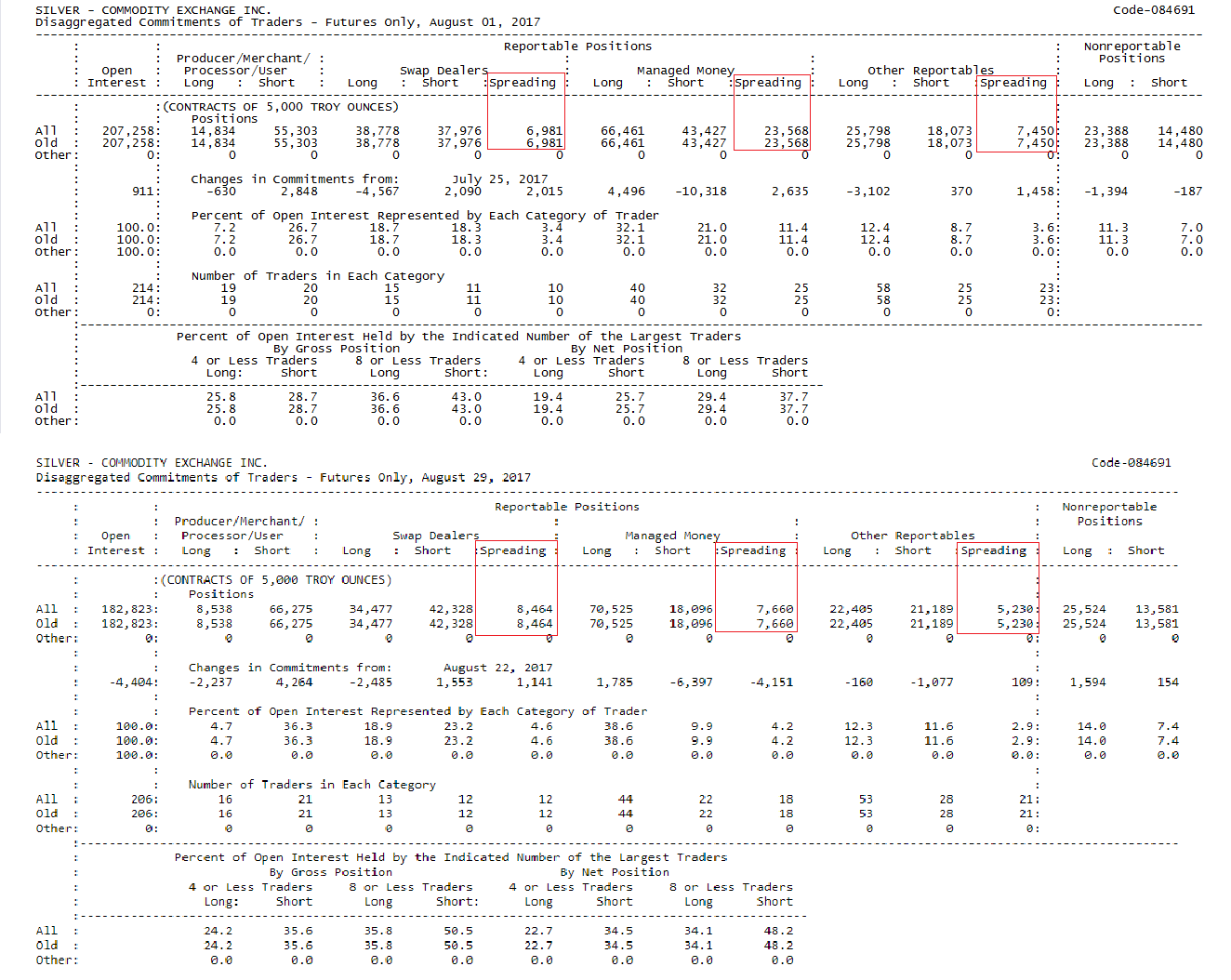 Wenn die Netto-Positionen beider großer Händlergruppen steigen, aber der Open Interest zurückgeht, dann müssen auch die Positionen innerhalb der Händlergruppen untereinander abgebaut worden sein. Im CoT-Report läuft dies unter dem Begriff „Spreading“. Und tatsächlich. Im Zeitraum von 01. – 29.08. stieg die Anzahl der untereinander gehandelten Kontrakte bei den „Swap Dealers“ zwar um 1.483 Kontrakte. Dagegen sanken sie innerhalb des „Managed Money“ um 15.908 Kontrakte.