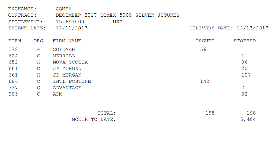 und am selben Tag 56 Silber-Kontrakte (280.000 Unzen) zum „Settlement-Preis“ von $15,697-, ebenso die Bullionbank „INTL FCSTONE“ 142 Silberkontrakte (142*5000=710.000 Unzen).