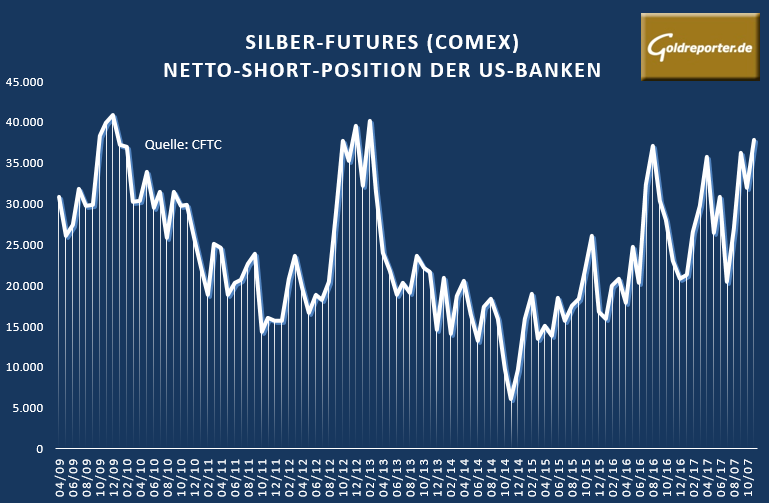 Im Bereich der Silber-Futures ist die Lage allerdings noch ausgeprägter (siehe blaue Grafik). Hier haben die US-Banken ihre Netto-Short-Position gegenüber Vormonat um 18 Prozent auf 37.843 Kontrakte (implizierte 5.884 Tonnen Silber) aufgestockt.