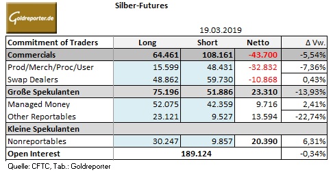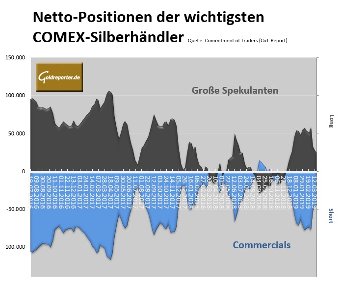 Die jüngsten CoT-Daten vom Handel mit Silber-Futures an der US-Warenterminbörse COMEX zeigen per 19. März 2019 folgende Veränderungen in den Positionen der bedeutendsten Händlergruppen.