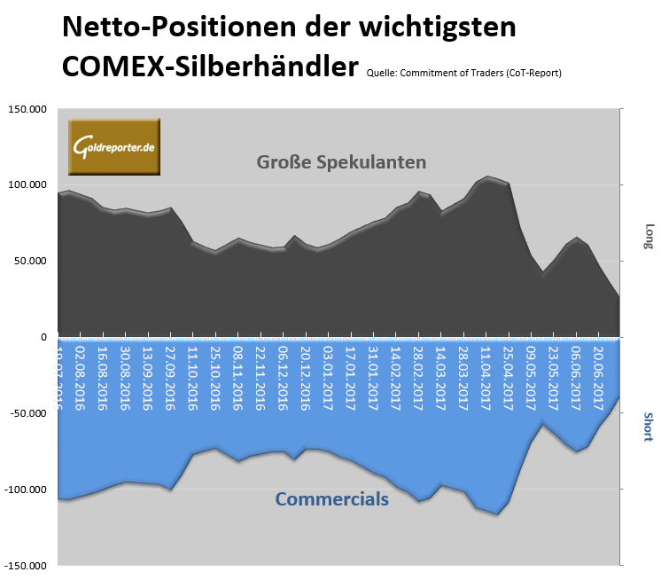 Die wöchentlichen CoT-Daten vom US-Handel mit Silber-Futures zeigen per 3. Juli 2017 folgende Veränderungen.