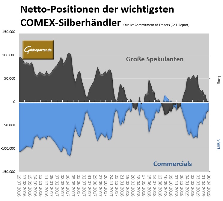 Die aktuellen CoT-Zahlen vom Handel mit Silber-Futures an der US-Warenterminbörse COMEX zeigen per 30. April 2019 folgende Veränderungen in den Positionen der bedeutendsten Händlergruppen.