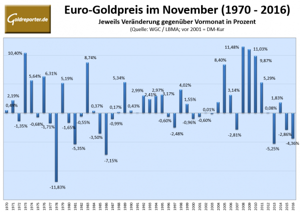 Der November ist statistisch gesehen der drittbeste Goldmonat des Jahres. Im vergangenen Jahr gab es aber ein kräftiges Minus beim Euro-Goldpreis.