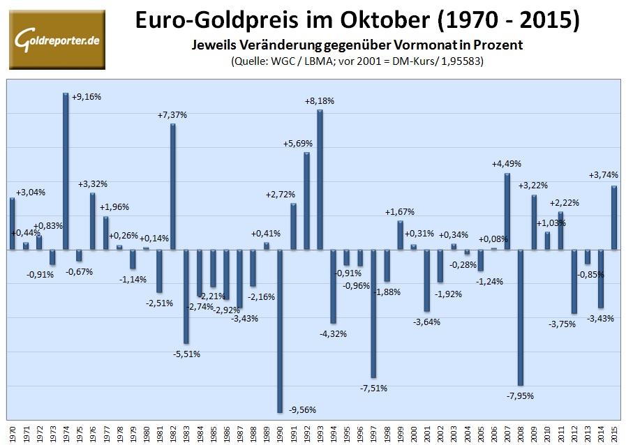 Im vergangenen Jahr brachte der Oktober ein deutliches Plus von 3,74 Prozent. Ende Oktober 2015 wurden für die Feinunze Gold 1.033,29 Euro bezahlt.