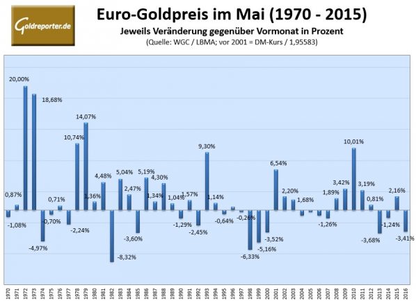 In den vergangenen 47 Jahren schloss der Euro-Goldkurs im Mai 27-mal mit positiven Vorzeichen (57 %). Vergangenes Jahr ergab sich allerdings ein Kursverlust von 3,41 Prozent.