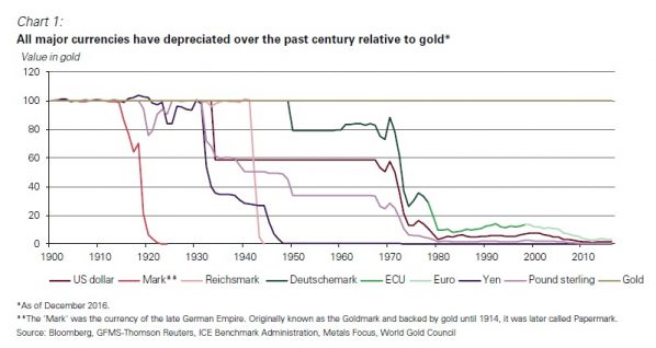In seinem aktuellen „Market Outlook Januar 2017“ hat der World Gold Council genau dies getan. Die folgende Grafik veranschaulicht die Abwertung verschiedener Währungen seit Anfang des 20. Jahrhunderts gegenüber Gold.