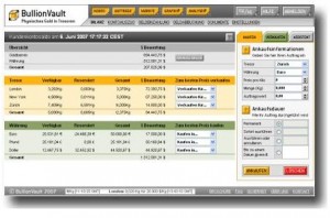 Der Goldhandel erfolgt auf die gleiche einfache Weise wie bei jedem Online-Broker oder beim Online-Banking. Sobald man Geld auf sein BullionVault-Konto eingezahlt hat, wählt man aus, an welchem Ort man das Gold erwerben möchte (New York, London oder Zürich), ggf. in welcher Währung man kaufen möchte und wie viel Gold es sein soll.