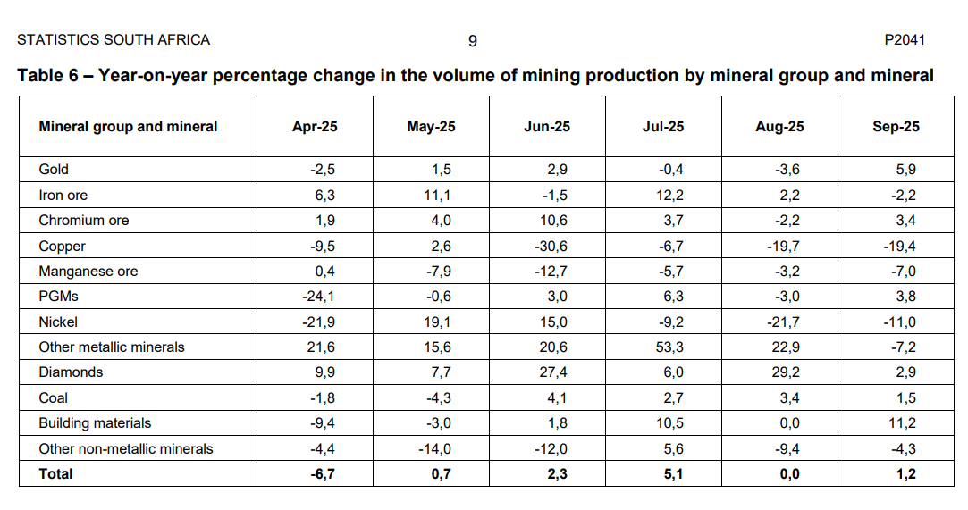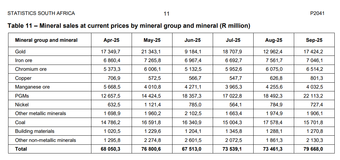 Auch der Markt für Metalle der Platin-Gruppe (PGM) zog deutlich an. Der Umsatz stieg im Monatsvergleich um 20 Prozent auf 22 Milliarden Rand (1,1 Mrd. Euro). Gegenüber September 2024 ergibt sich ein Zuwachs von 54 Prozent. Zugleich lagen die Erlöse 29 Prozent über dem Schnitt der vorangegangenen sechs Monate.